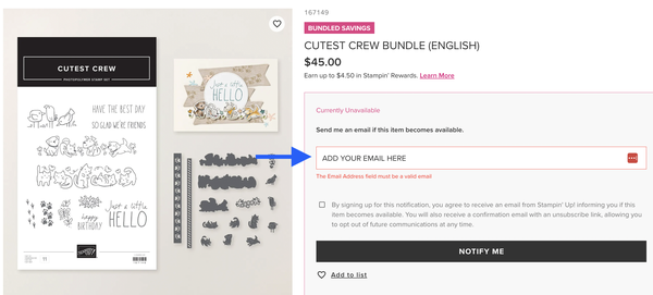The Cutest Crew bundle (167149) is currently out of stock (stamp set is available, but the dies are not). However, it's expected back in stock the week of April 27. If this, or any other product that you want is currently out of stock, you can add your email to the notifications list. Once it's back in stock, you'll get an email from Stampin' Up!.