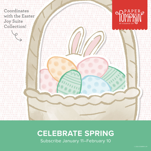 and/or gifts. You can start and stop at any time. To begin, subscribe by the 10th of the month to receive that month's kit. Then your crafting boxes will keep coming until you tell it to hold a month/s or cancel. FEBRUARY Kit: Celebrate Spring Subscribe January 11–February 10 Craft whimsical handmade cards that celebrate Easter and sweet spring days. • Makes 9 cards: 3 each of 3 designs with 9 coordinating envelopes • Precut paper pieces and pink baker’s twine • Iridescent pink and yellow sequins • Coordinating colors: Balmy Blue, Crumb Cake, Lemon Lolly, Peach Pie, Pretty in Pink, Shy Shamrock (Classic Stampin’ Spot) Read Details & Sign Up for Paper Pumpkin: www.mailsomethingpretty.com/paperpumpkin