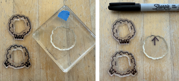 stamp set as an example. You can either place temporary tape on the block showing which side is up or draw an arrow with a permanent marker on the stamp itself. Both of these methods will make it easier to stamp the filler part of the stamp after you stamp the outline image. If you use the permanent marker method, you only have to