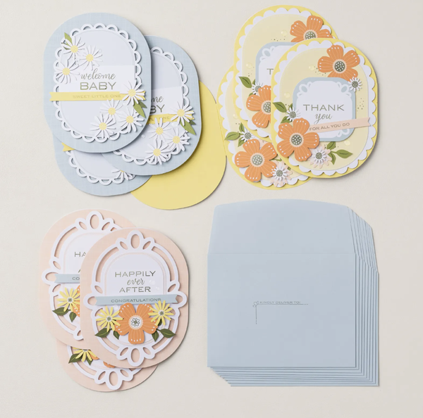 Have cards ready for life’s happiest events. With the Happy Happenings Kit, you can quickly craft cards to welcome a new baby, celebrate a wedding, or say thank you. These oval cards feature layered designs and pearlized details. Create them as shown or customize each one for the occasion. DETAILS - Makes 9 cards: 3 each of 3 designs - Folded card